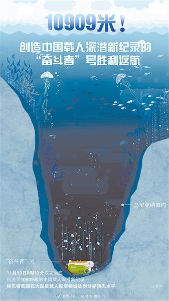 “十三五”以来,科技部会同中国科学院,组织近百家科研院所、高校、企业近千名科研人员,经过艰苦攻关,成功完成“奋斗者”号的研制工作。自10月10日起,“奋斗者”号远赴马里亚纳海沟开展第二阶段万米海试,成功完成了13次下潜,其中8次突破万米。11月10日8时12分,“奋斗者”号在马里亚纳海沟成功坐底,创造了10909米的中国载人深潜新纪录,标志着我国在大深度载人深潜领域达到世界领先水平。