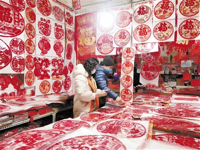 市民正在挑选牛年剪纸福字。 陈曦 摄 选张“福”字迎新春