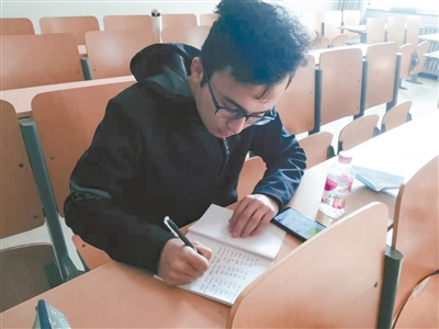 公共卫生学院2020级预防医学专业比拉力江正在教室学习。