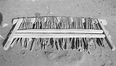 盖的结构比较简单,主体为木制,叫盖框(顺平康关当地习惯误读作guāng音)子,其整体形状很像个缺少一条长边的长方形,前端的粗框上大多开有凹槽形透缝,用于安插盖条之用,下面正中间的地方固定着一个可以转动的铁环——转环。另在框架中间还安着两根横框,起稳定框架的作用,同时也是在使用过程中人脚踩的地方。盖条就是安插在盖框子上的那些纵向细木条,多用藤条或荆条做成。制做时首先要根据盖框子的大小截取一定长度的荆条,然后对其中间进行拧扭,使之成为“n”形。逐次将盖条密密地穿插在盖框子上以后,一具完整的盖就可以投入使用了。