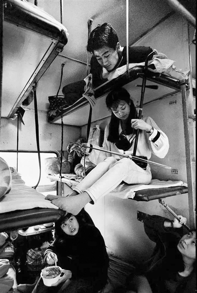 1996年,广州-成都 卧铺车厢里拉二胡的姑娘。