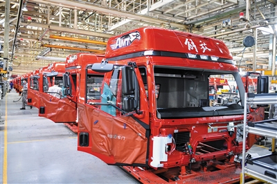 图为工人在位于长春的一汽解放总装车间装配车辆。