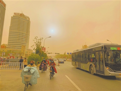 昨日,我市迎来大范围扬沙和浮尘天气,局地出现降雨。市民佩戴口罩眼镜出行。 本报记者 贾博钧 摄