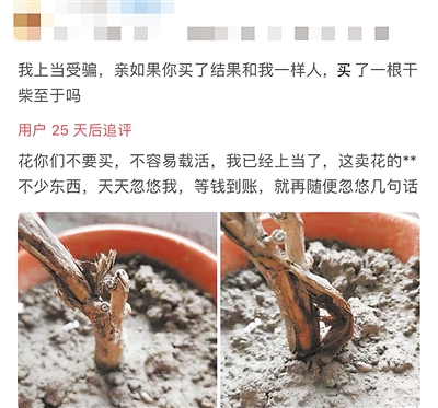 消费者投诉后,网购平台客服要么不理会,要么把责任推卸给消费者——“栽培的方法不对”;或以“这笔交易时间已过了维权期”为由,拒绝赔付,致使消费者维权难度大、成本高。