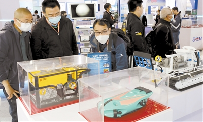 4月15日,参观者在一组用于水下作业的机器人模型展品前驻足观看。