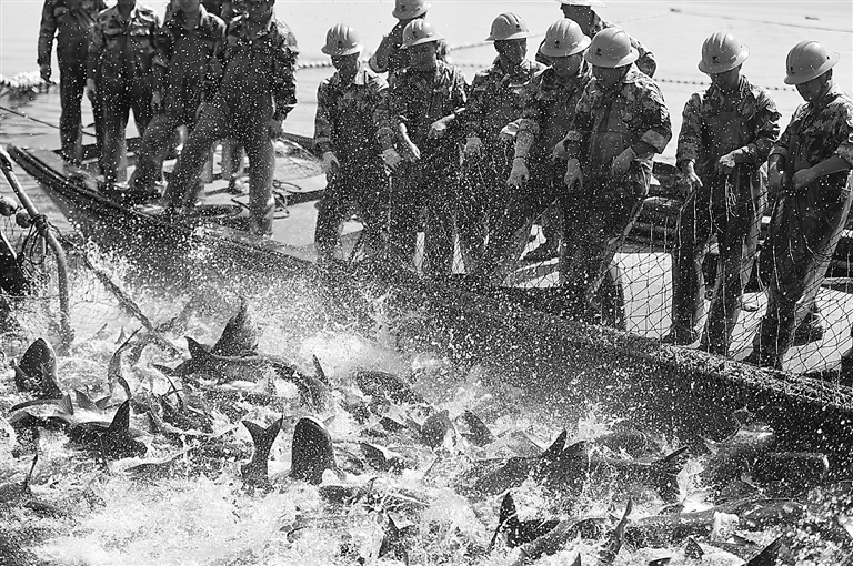 9月23日,千岛湖发展集团的捕捞队员在安阳口水域进行巨网捕鱼。