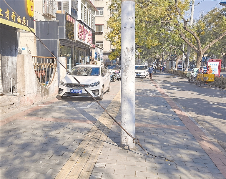 赵先生的父母住在市二医院附近的依棉宿舍,老人和小区邻居出行经常需要经过向阳南大街,“从二医院东门南行200米左右的西侧人行道上,有一个用来固定电线杆的斜拉钢索,正好就在盲道正上方。”据赵先生观察,与此钢索相连的线杆在围墙里的小区内,“这个钢索比较松,线杆看起来也比较老旧,像是废弃的。”赵先生认为,即使需要固定小区里的线杆,这根钢索也不应该设置在小区外的人行道上,“附近住的多是老人,白天经过这里都得走近了才能看到,往往吓一跳,晚上就更不容易看到这根斜拉钢索了。行人走到这里很容易被绊倒,而且对盲人也极其不利。”赵先生建议:“希望相关部门尽快来看看这根线和相连的线杆到底还有没有作用,能不能拆除,去掉安全隐患。”