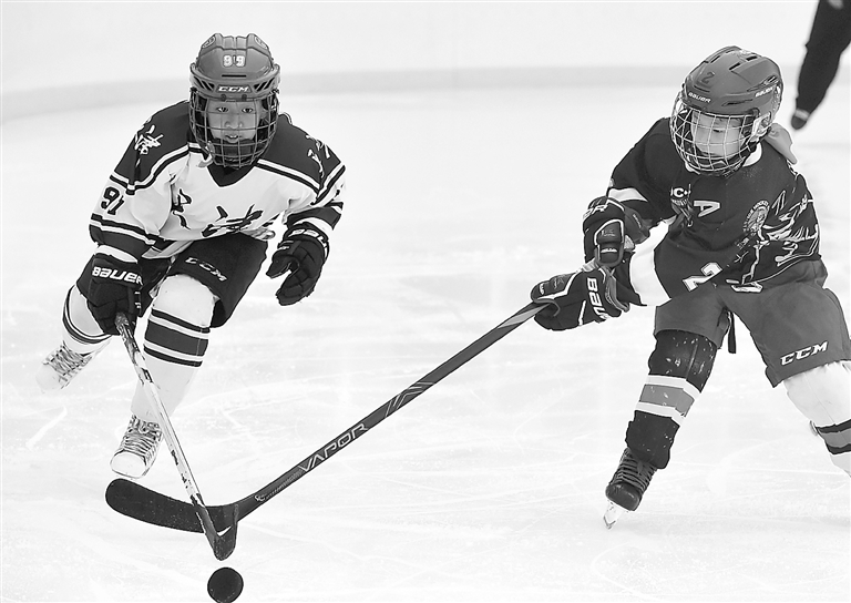 这是天津U10队球员芦维翰(左)在2020年全国青少年U10年龄组冰球邀请赛中进攻(2020年8月6日摄)。