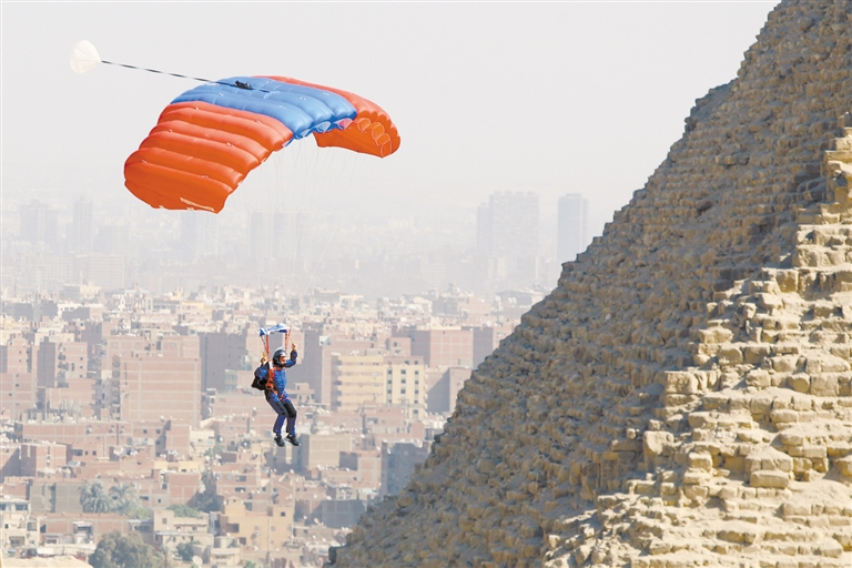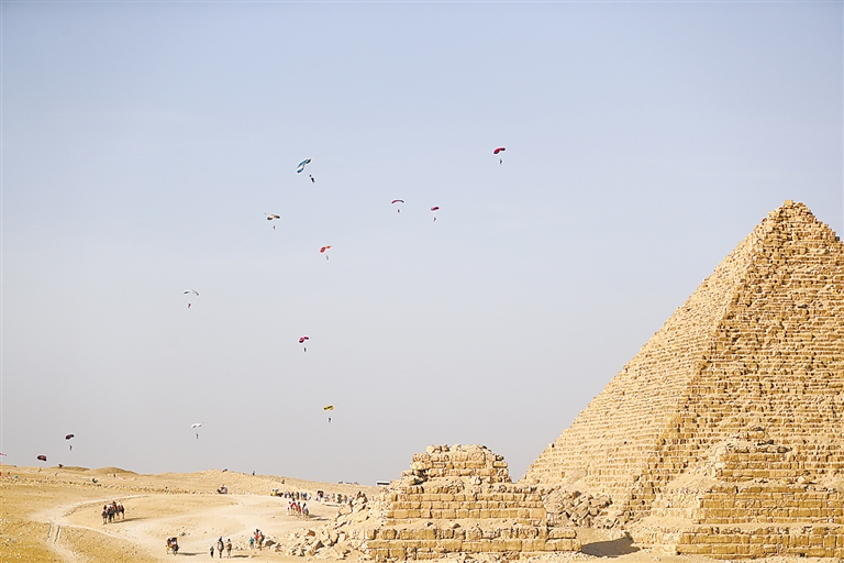 第四届金字塔国际跳伞节1日在埃及首都开罗附近的吉萨金字塔景区开幕,来自埃及、巴西、加拿大等30个国家和地区的200余名专业跳伞运动员参加。 新华社记者 隋先凯 摄