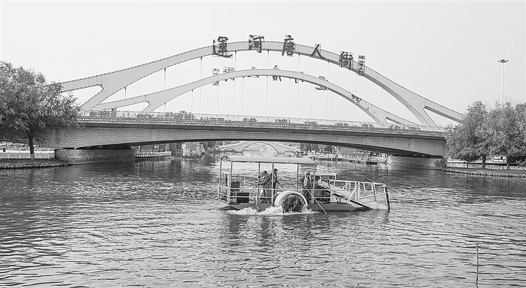 11月1日,工人在唐山市丰南区运河进行打捞作业。深秋时节,河北省唐山市丰南区河湖杂物打捞工作有序展开。丰南地处沿海,境内河、湖水均流入渤海,为此该区在坚持落实河(湖)长制的基础上,建立专业队伍,适时打捞河湖水中杂物,确保水质清洁。
