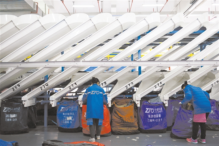 智能分拣加速快递“奔跑” 11月11日,在中通智慧电商产业园内,工作人员将分拣后的快递装袋。随着“双十一”网购高峰期的到来,在位于湖南省长沙市的中通智慧电商产业园内,大大小小的包裹在交错纵横、快速运转的传送带上“奔跑”。自动分拣区内,射频识别、可视化跟踪、动态称重等智慧科技辅以人工操作,加速物流包裹的准确流转。 新华社记者 陈振海 摄