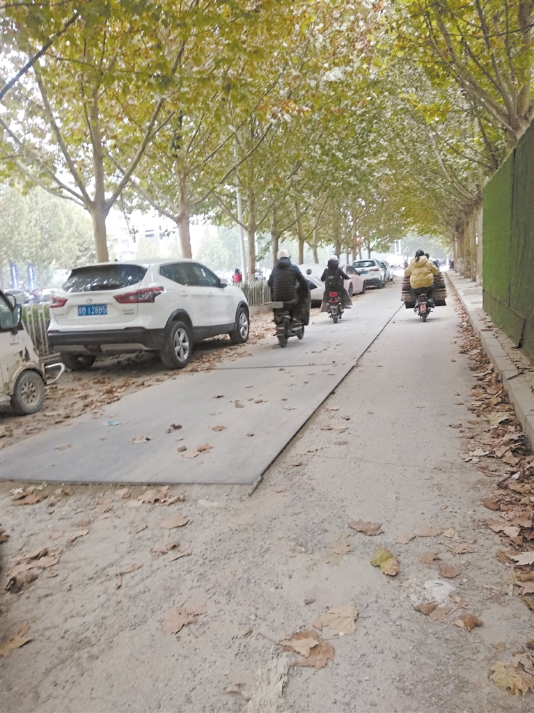 据刘先生讲,他住在附近,每天接送孩子上下学都要走这段路,在他的印象中,这几块钢板在路上已经铺了一年多的时间了。“这条路看着不窄,可是路旁边停着车,大家又大多愿意绕着铺钢板的路面走,这样可供自行车走的路就特别少了。”刘先生说,前两天下雪了,很多人为了绕着这段铺钢板的路走,就骑着电动车借道到机动车道上去走了,非常危险。