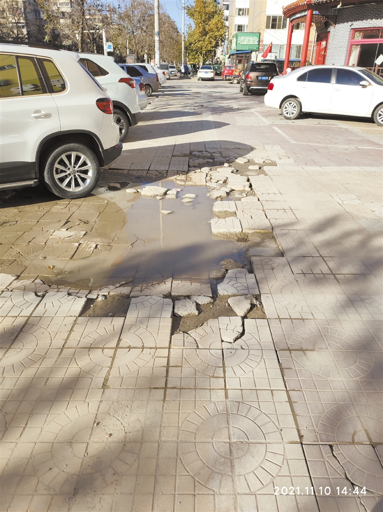 ▲李庄街和城苑路交叉口北,两侧便道破损严重。 吴培 摄