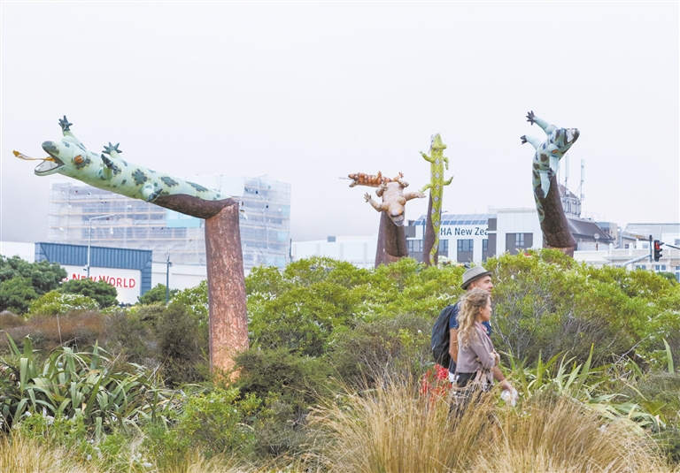3月9日,新西兰视觉艺术家丽莎·莱哈娜的作品《天空舞者》——6只充气壁虎在新西兰首都惠灵顿市中心展出。2022年新西兰艺术节于2月至3月在首都惠灵顿举行。近日由于新西兰境内新冠疫情持续恶化,艺术节观众明显少于以往。 新华社发