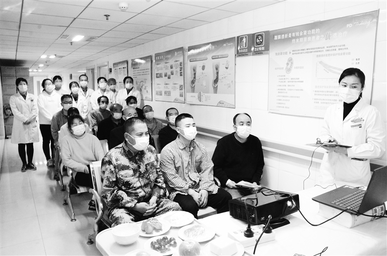 陆军第82集团军医院营养科定期为慢性肾病和腹膜透析患者举办营养知识讲座,让患者在接受药物和透析治疗的同时,注意饮食治疗,告诉患者“吃什么、怎么吃、补什么、忌什么”,患者照方吃饭,科学用餐,治疗效果十分明显。图为3月17日,营养科在肾脏病区进行营养科普宣传。 付伟红 陈杰 摄