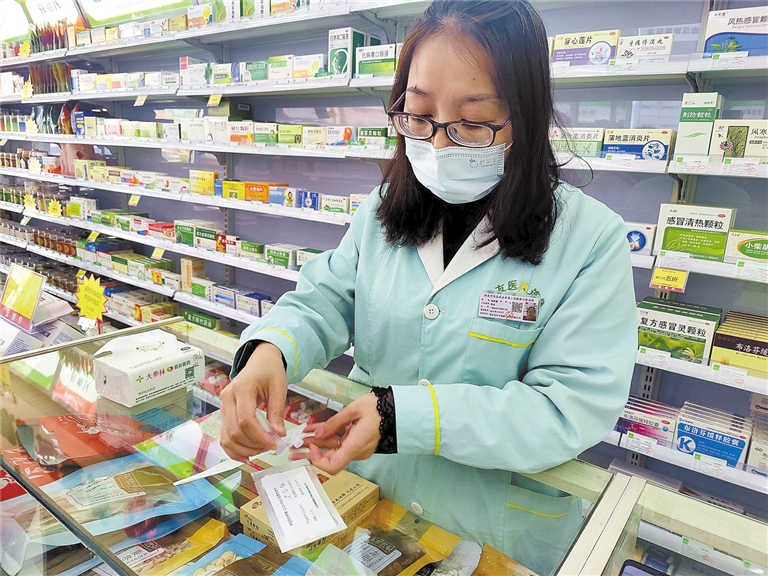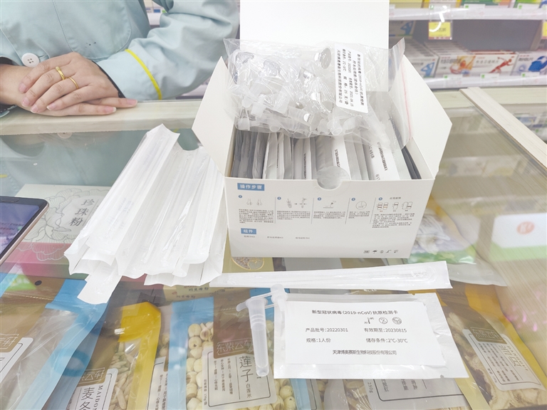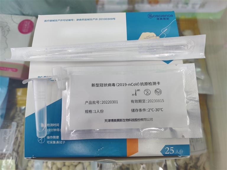 “取出采样器,将鼻拭子伸进鼻子里1.5厘米,两边鼻孔分别转动4圈,放入处理液中,再滴在检测卡上,15分钟后即可出结果……”记者在益友医药看到,药店负责人正拿着“自测版”的抗原试剂盒仔细讲解其使用方法。“我听了一遍就会了,这个试剂简单又方便,我要给家里人都备一盒。”市民李慧琴说。店内已有不少消费者按需进行购买。