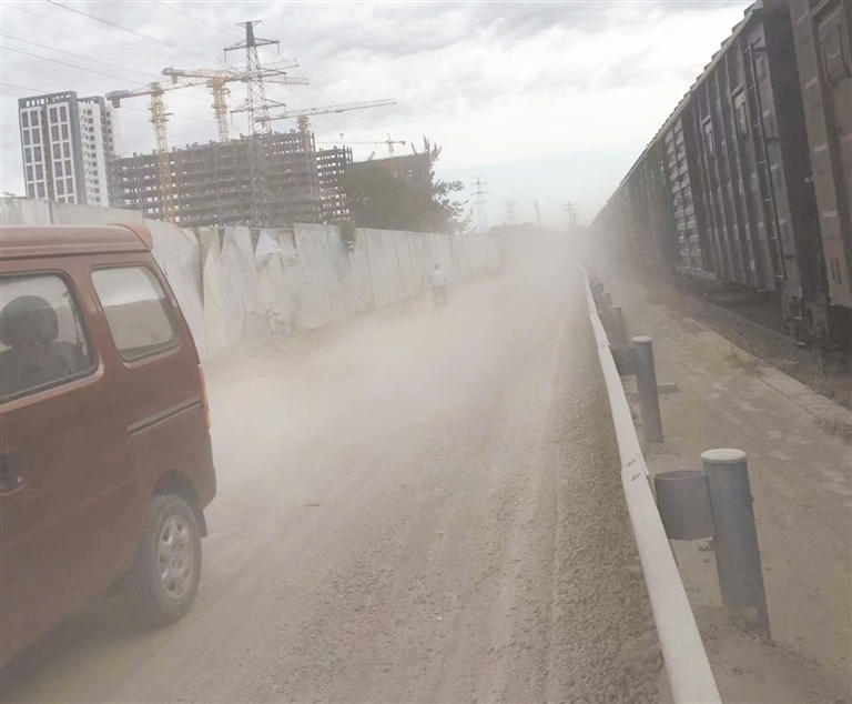 按照李女士的提示,记者沿着东风西路到乐凯南大街南行300米左右,转弯向西来到康庄路,随后继续西行,经过二棉宿舍,在铁路西侧,记者看到李女士提到的这条路。只见路面积土较多,每当有汽车经过,就会有严重的扬尘,行人走在其中,迅速被尘土笼罩。汽车经过此处,都是紧闭车窗。附近有楼盘正在施工,路旁设有围挡。记者搜索百度地图,并没有查到这条路的路名。