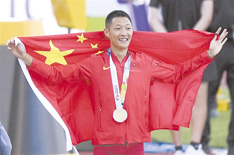 7月16日,王嘉男在夺冠后庆祝。当日,在美国俄勒冈州尤金市举行的2022世界田径锦标赛男子跳远决赛中,中国选手王嘉男以8米36的成绩夺得冠军。 新华社记者 吴晓凌 摄