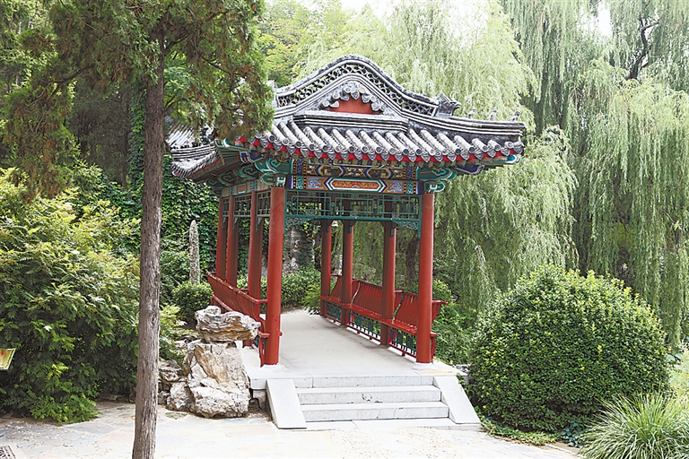 古莲花池含沧亭在篇留洞东北。这是一座桥亭,也叫廊桥或屋桥,上亭下桥,南北两侧檐柱间设护栏,既可供游人过河,又可供游人避雨、坐憩和驻足赏景,南塘东沟回归北塘的水即流经此桥下。方观承《莲池行宫十二景图咏·含沧亭》这样描述:“亭跨池东水上。西挹瀰淼,东注石窦,湍飞流激。每凭风延咏,如闻濯缨之歌。”