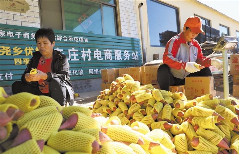 据了解,辛庄村是远近闻名的红薯种植村,红薯种植面积2000多亩。2017年,村里成立了金实红薯合作社,通过“产业+合作社+基地+农户”经营模式,实现了统一种植、统一销售。2019年,合作社引进了蜜薯这个新品种。皮薄如纸、香甜软糯的蜜薯一上市就受到消费者青睐,由于含糖量高、口感好、品相佳,一斤卖到了6块钱左右。
