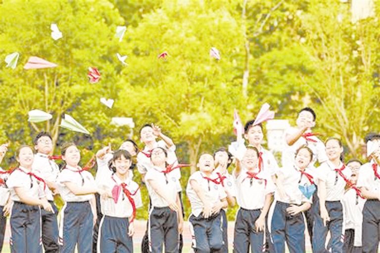 邯郸市邯山区阳光实验小学的毕业生们放飞写有梦想的纸飞机。 河北日报通讯员 李昊 摄