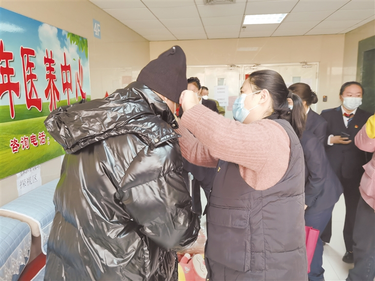 天气渐冷,社区工作人员和志愿者为特困残疾人送来了羽绒服、毛线帽等。 霍若雯 摄