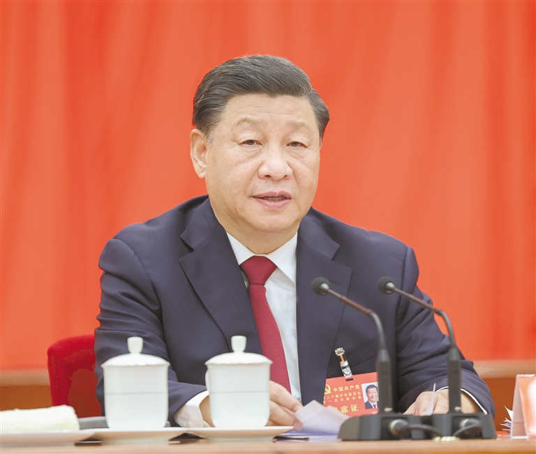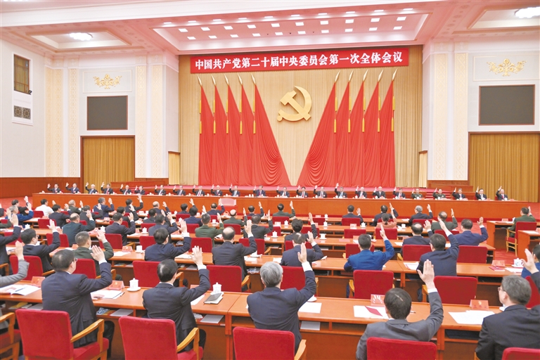 左图:10月23日,中国共产党第二十届中央委员会第一次全体会议在北京人民大会堂举行。习近平同志主持会议并在当选中共中央委员会总书记后作重要讲话。 新华社记者 鞠鹏 摄 上图:10月23日,中国共产党第二十届中央委员会第一次全体会议在北京人民大会堂举行。 新华社记者 李涛 摄