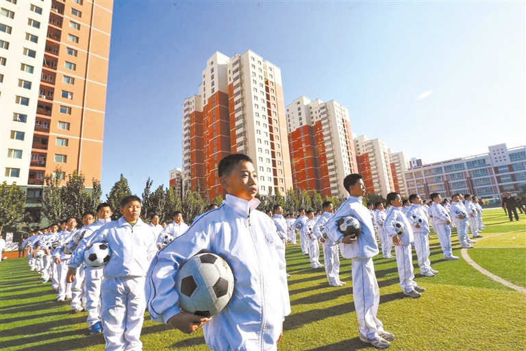 学生进行足球训练。