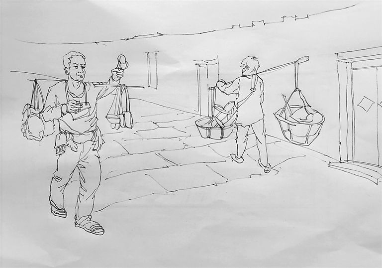 那时的沿街叫卖者,不大的担子、筐子或小推车里能装满各式各样的商品。春雨绵绵,有人出不了家门买菜,不要紧,卖菜的会挑着一担碧绿的蔬菜从你家经过。卖菜的大爷这么吆喝:“茄子、黄瓜、洋白菜、西红柿、韭菜架扁豆来……”可以随便挑选,讨价还价。炎夏的日子,暑气蒸人,安静的午后,街头巷尾会听到“冰棍、奶油冰棍、小豆冰棍……”,这是推小车卖冰棍的老奶奶略带沙哑的叫卖声。这声音对于我来讲是那么亲切,那么让我“想入非非”。那时候没有空调,电扇也极少,吃冰棍是最好的解暑降温方式。