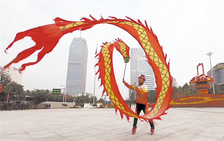 3、在市人民广场,市非遗传承人王长江脚蹬轮滑,舞起中华龙。