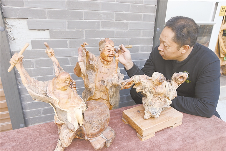 2、市级非遗根雕传人葛云飞,以根雕与大写意相结合的技法,创作作品《欢天喜地》。