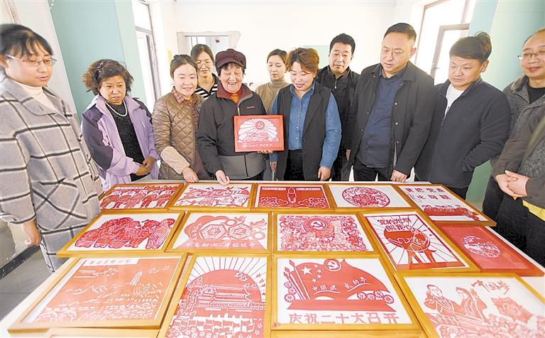 6、市竞秀区先锋街道勘察社区82岁的李秀贞谈起《庆祝二十大》剪纸作品,喜悦之情溢于言表。
