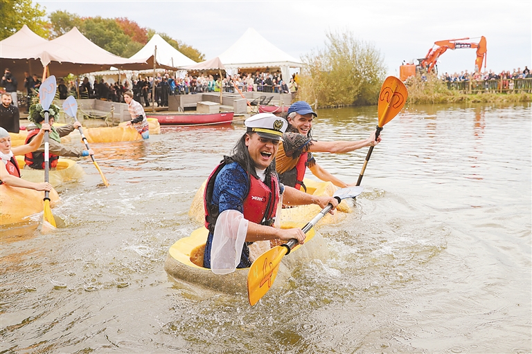 10月23日,比利时卡斯特莱市利赫塔尔特村举行划南瓜船比赛。自清晨开始,工作人员将巨大的南瓜挖空,制作成一艘艘“南瓜船”。据了解,这些南瓜在挖空之前的重量可达数百公斤。 新华社记者 郑焕松 摄