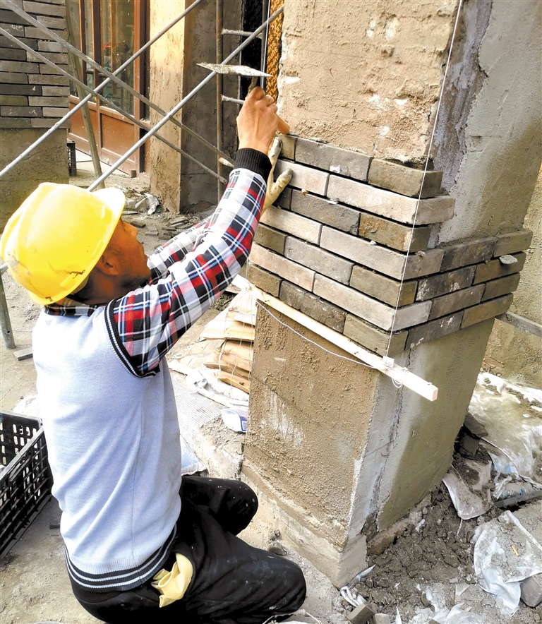 没过多久,工人们带着我们开始进行铺贴实验。经过半个月的铺贴工艺改进、铺贴效果比对后,铺贴方案确定下来。改进后的方案对铺贴操作要求很高,胶抹厚了,砖贴得不平整、垂线不直,都会影响整体效果。最终,经过层层选拔,50名铺贴能手从200名铺贴工人中脱颖而出,可以拿我们进行作业。