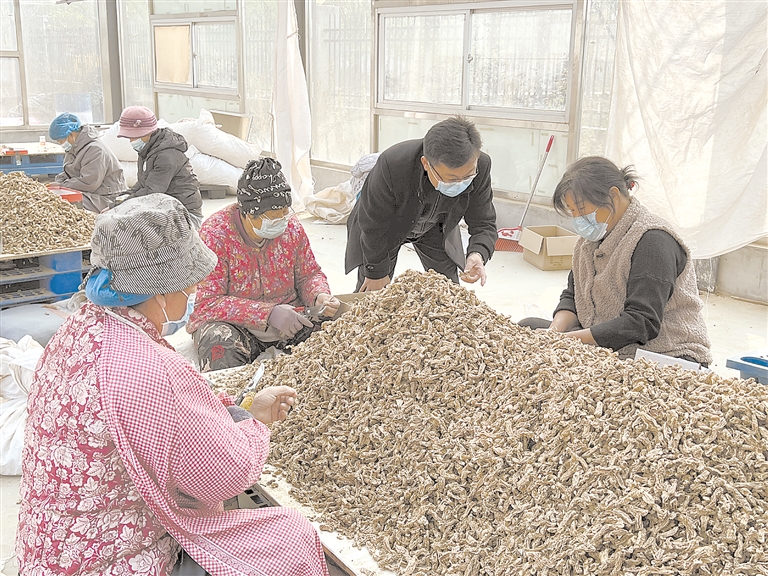 河北农业大学刘廷辉老师(右二)在知母分拣车间对农户进行技术指导。 王琴 摄