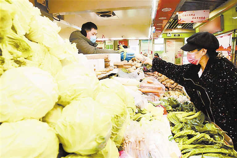 近期虽然天气寒冷,天津红桥区各市场农副产品品种保持丰富,供应充足,整体价格平稳。在监测的43个品种中,有26个监测品种价格环比下降,11个监测品种价格环比略有上涨,6个监测品种价格环比持平。图为红桥区和苑菜市场。
