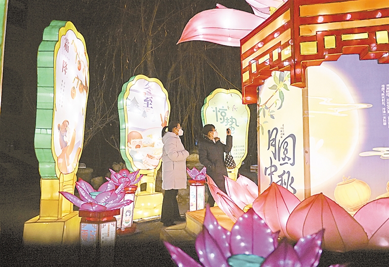 游客在中华石园新春民俗灯会赏灯游玩(1月26日摄)。春节期间,天津中华石园景区举办的新春民俗灯会吸引了众多游客。夜幕降临后,融合兔子、二十四节气等元素的各式彩灯结合现代光影变得惟妙惟肖、活灵活现。市民及游客在此赏灯游玩、“打卡”拍照,感受节日氛围。