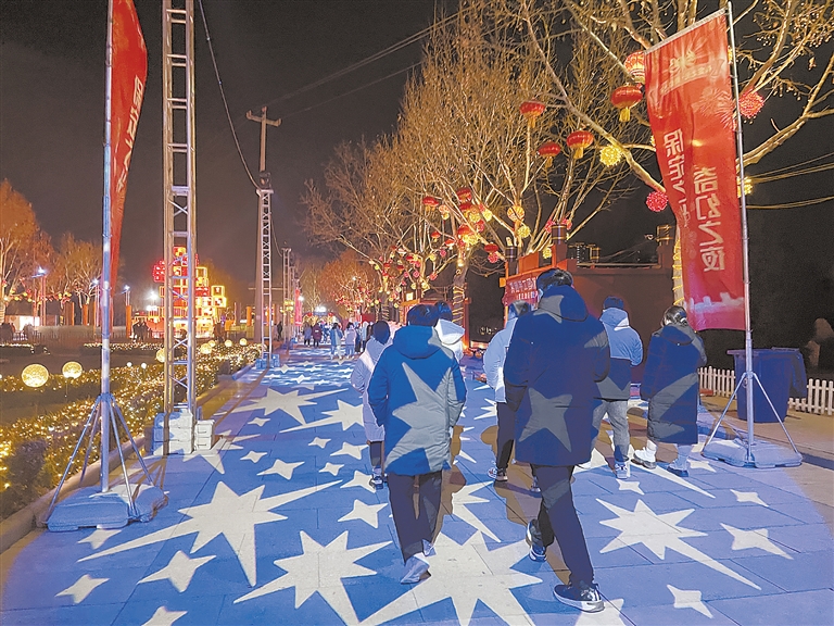 从正门进入园内,便来到了由灯光搭建而成的浪漫、梦幻、多彩的光影世界。高18米的“保定之光”主装置,搭配巨型环状屏幕,不断展示着城市的文化及发展成果。“非遗大道”让市民眼前一亮,摊位前灯光明亮、人头攒动,烤肉、雪花酪、牛轧糖等特色美食应有尽有,满足了市民的不同味蕾。投射到道路上的灯光不断变幻,一会儿是蓝色星星,一会儿是红色心形,小朋友们追逐着、跳跃着,现场十分欢乐。