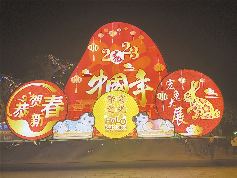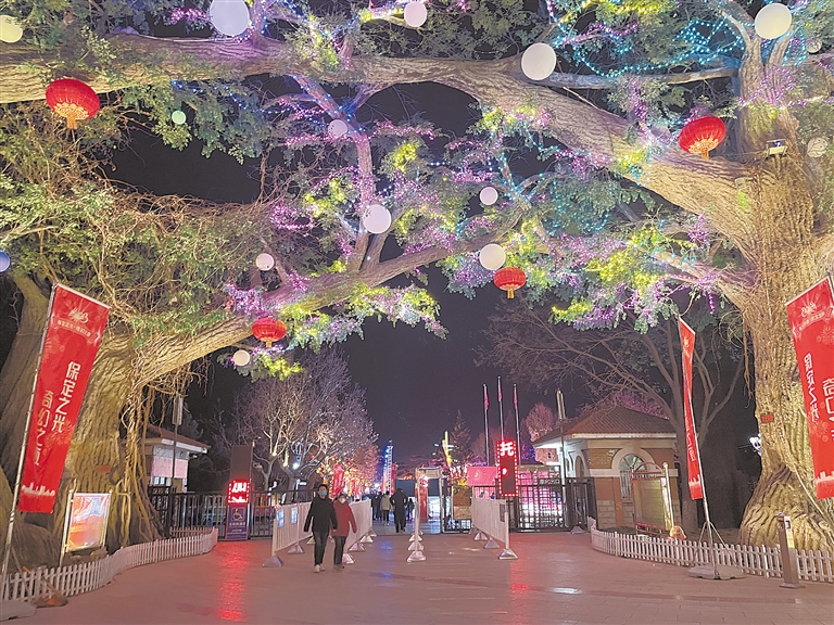 植物园正门广场上,标志性大树被璀璨的灯光装点,流光溢彩、火树银花,一派喜庆火红的春节气氛。12米高的“保定之光”巨幅灯光海报点亮夜空,其中,可爱俏皮的“保定之光”形象大使——“宝宝和顶顶”,引得不少市民朋友拍照打卡。据了解,“宝宝和顶顶”的设计灵感来源于曲阳定瓷“孩儿枕”,谐音保定,展现了古城深厚的地域特色和历史文化底蕴。