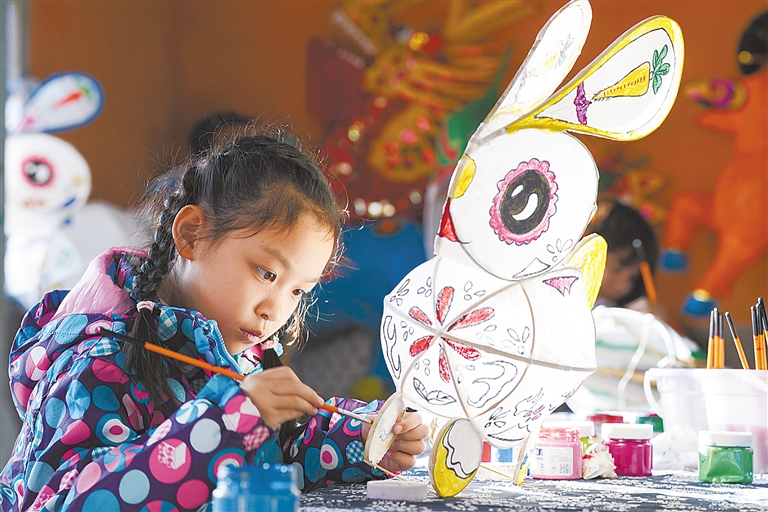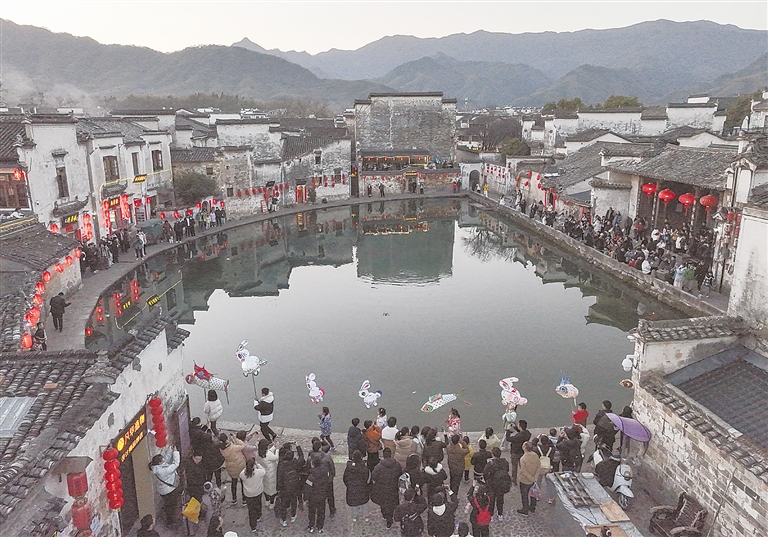 兔年新春,在安徽省黄山市黟县宏村,当地举行的花灯研习班邀请游客共同制作兔子形状花灯。傍晚时分,五颜六色的“兔灯”在古村中点亮,游客在“闹花灯”中体验徽州年俗。 新华社记者 杜宇 摄