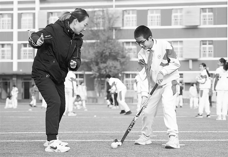 2月21日,在人大附中实验小学,体育教师张颖(左)在体育课中指导学生进行曲棍球基本技术动作练习。近日,北京市中小学生迎来新学期。北京市海淀区中关村学区内的中小学开展健身健美、极限飞盘、旱地冰球等特色体育课,在丰富学生校园文体生活的同时,助力学生健康成长。
