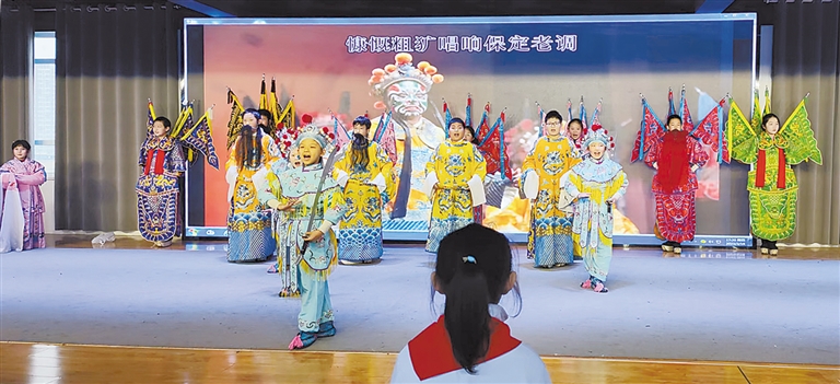 学校还让演出“走出去”,登上更高、更广的舞台。2021年1月3日,河北小学老调社团演唱的《红衣仙子》选段和《潘杨颂》选段参加了中央电视台春节儿童节目的录制。2022年,老调节目《打疫苗》《百年风雨百年情》《创建儿童友好城市》《在家奉了严亲命》《你杨家为大宋南征北战》、河北梆子《金牌调来银牌宣》、京剧《花田错》选段、评剧《火红的太阳出东方》8个戏曲节目参加保定首届儿童春晚录制,老调《继往开来》参加了2022年保定春节联欢晚会的录制。今年1月16日,老调戏歌“保定欢迎您”登上保定春节联欢晚会。