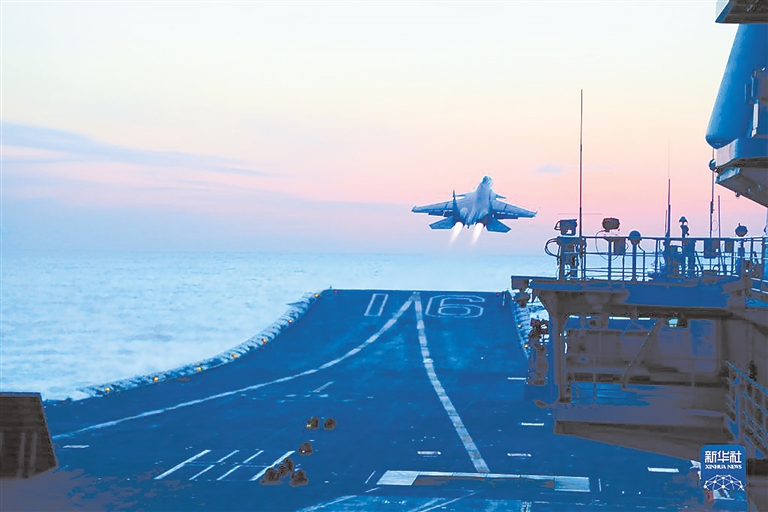海军航空大学某基地飞行员驾驶歼-15战机滑跃起飞。 新华社发(姜涛 摄)
