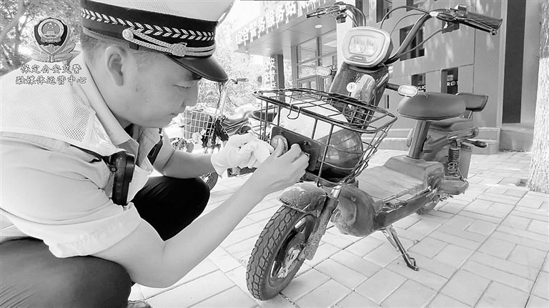 交警将车贴贴在非机动车的显著位置。
