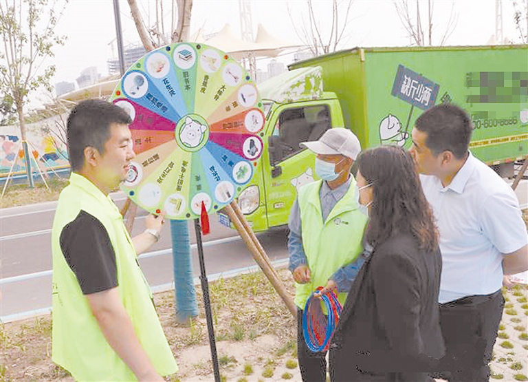 在北湖公园,涉及垃圾分类知识的转盘游戏,简单易答,吸引众多居民参与。