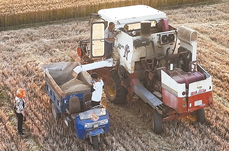 收割机紧张作业。