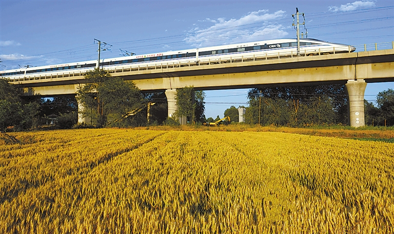 清苑区高铁线两侧,飞速行驶的和谐号、复兴号往来穿梭于麦田上空。