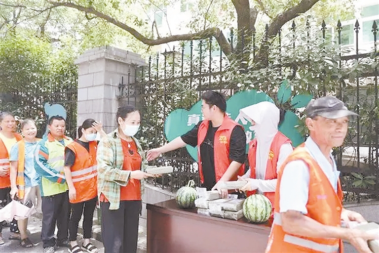 在江西南昌青山湖区站东街道,环卫工人领取防暑降温物品(7月14日摄)。 新华社记者 彭昭之 摄