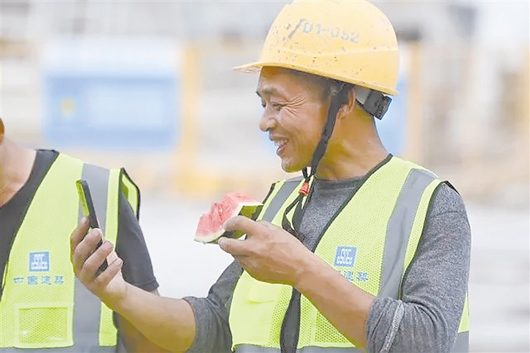 7月12日,杭州某项目部一名工人在休息站吃西瓜时与家人视频聊天。 新华社记者 黄宗治 摄