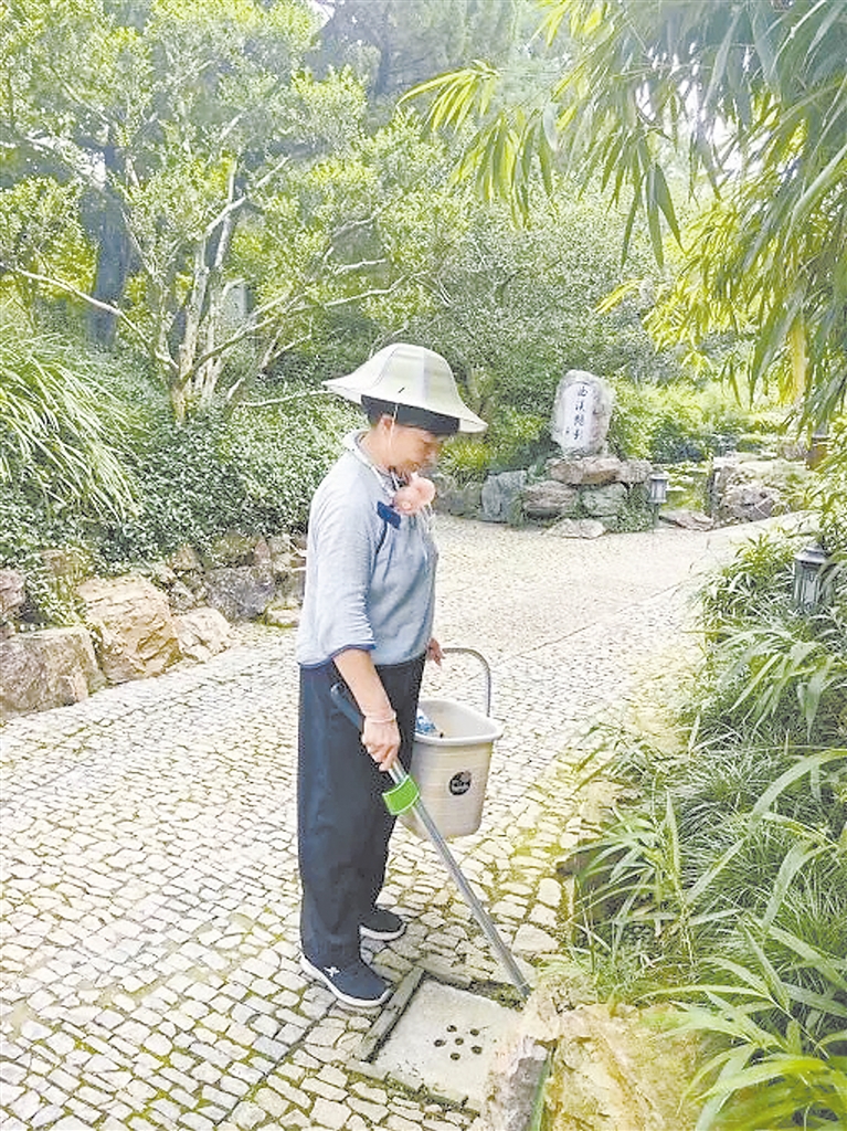 上海古猗园的一名保洁人员在工作。 新华社记者 董雪 摄